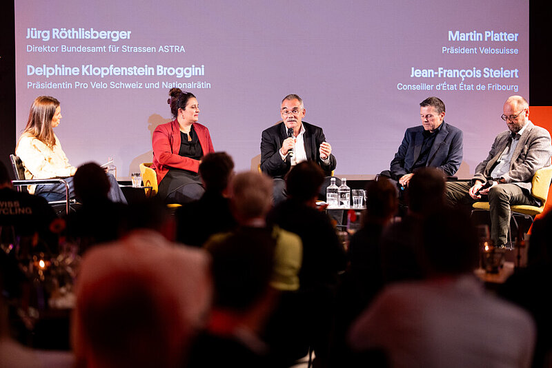 So war an diesem Veloforum der Rahmen gesetzt. Der Abend drehte sich um die Halbzeit beim Veloweggesetz und generell um die Schweizer Velowende. War vor einem Jahr Bundesrätin Elisabeth Baume-Schneider die Hauptrednerin des Veloforums, nahmen diesmal Politikerinnen wie Pro-Velo-Präsidentin Délphine Klopfenstein Broggini und ihr ehemaliger Kollege und Freiburger Staatsrat Jean-Francois Steiert Stellung. Auf der anderen Seite sass Astra-Direktor Jürg Röthlisberger und dazwischen Velosuisse Sekretär Martin Platter.